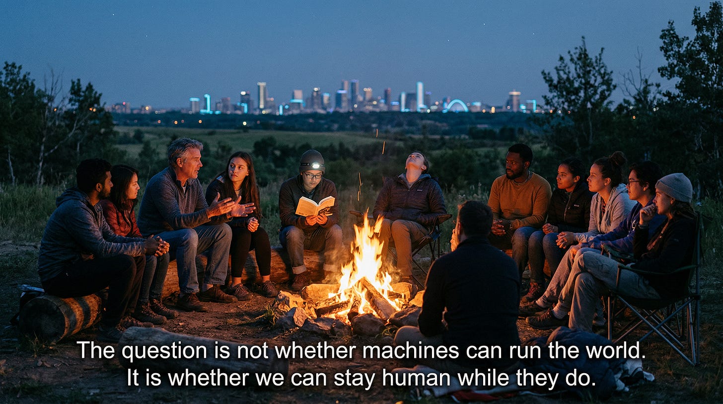 Every wisdom tradition that speaks of a Creator resting on the seventh day also insists on something the Silicon Valley narrative conveniently omits: the Creator did not abdicate. God did not hand the keys to an algorithm and walk away. The Sabbath — in Jewish, Christian, and Islamic thought alike — is not passive. It is an active choosing to step back, to reflect, to reconnect with what matters. It requires the discipline of restraint and the confidence that comes from having built something good.