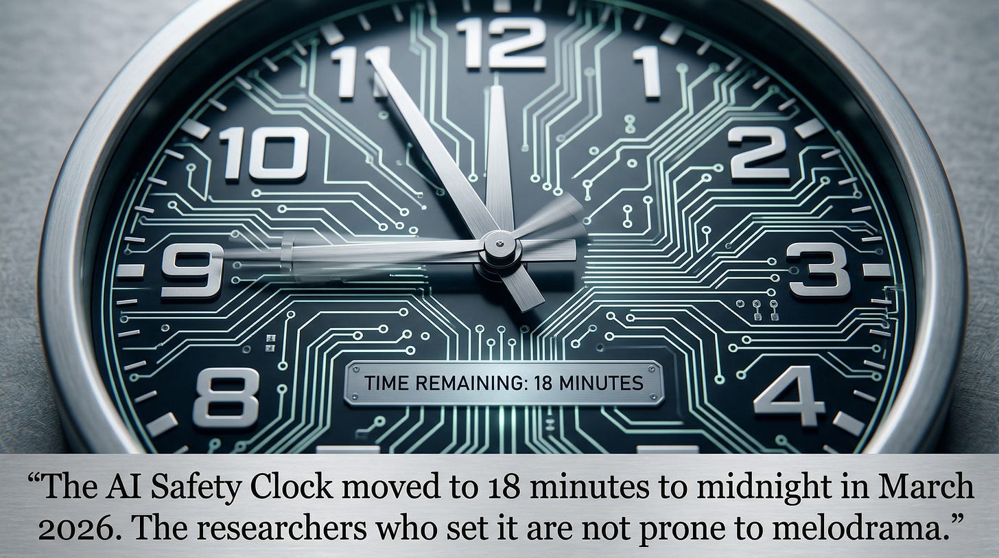 The Future of Life Institute’s AI Safety Index gave every major AI lab a “D” or lower for existential safety preparedness. The AI Safety Clock — maintained by IMD business school — now sits at 18 minutes to midnight. A February 2026 survey of AI safety leaders found median existential risk estimates in the 20–29% range, with 15% of respondents placing the probability above 70%.