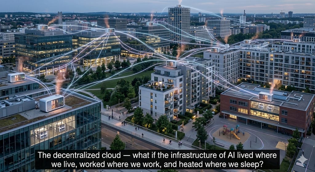 Just imagine: instead of one data center draining a third of a small town’s water supply, thousands of small nodes spread the load so widely that no single community bears the burden. Instead of waste heat venting uselessly into the atmosphere through massive cooling towers, that heat warms your shower water. Instead of your electricity bill subsidizing a transmission line to a tech campus you will never visit, the compute infrastructure pays you — in reduced heating costs, in rental income for hosting a node, in a more resilient local grid.