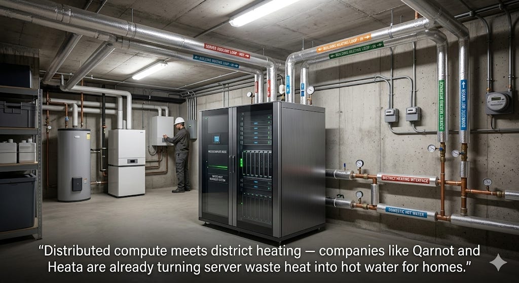 Qarnot Computing in France distributes servers into building heating systems, converting up to 95% of compute waste heat into hot water for residents. Heata in the UK installs servers inside homes, transferring waste heat into domestic hot-water cylinders. Leafcloud in Amsterdam places servers in apartment complexes, swimming pools, and retirement homes. In the Nordics, this is already mainstream — Microsoft heats thousands of homes in Denmark from data center waste heat, and a joint venture in Espoo, Finland provides 40% of the city’s district heating from compute.