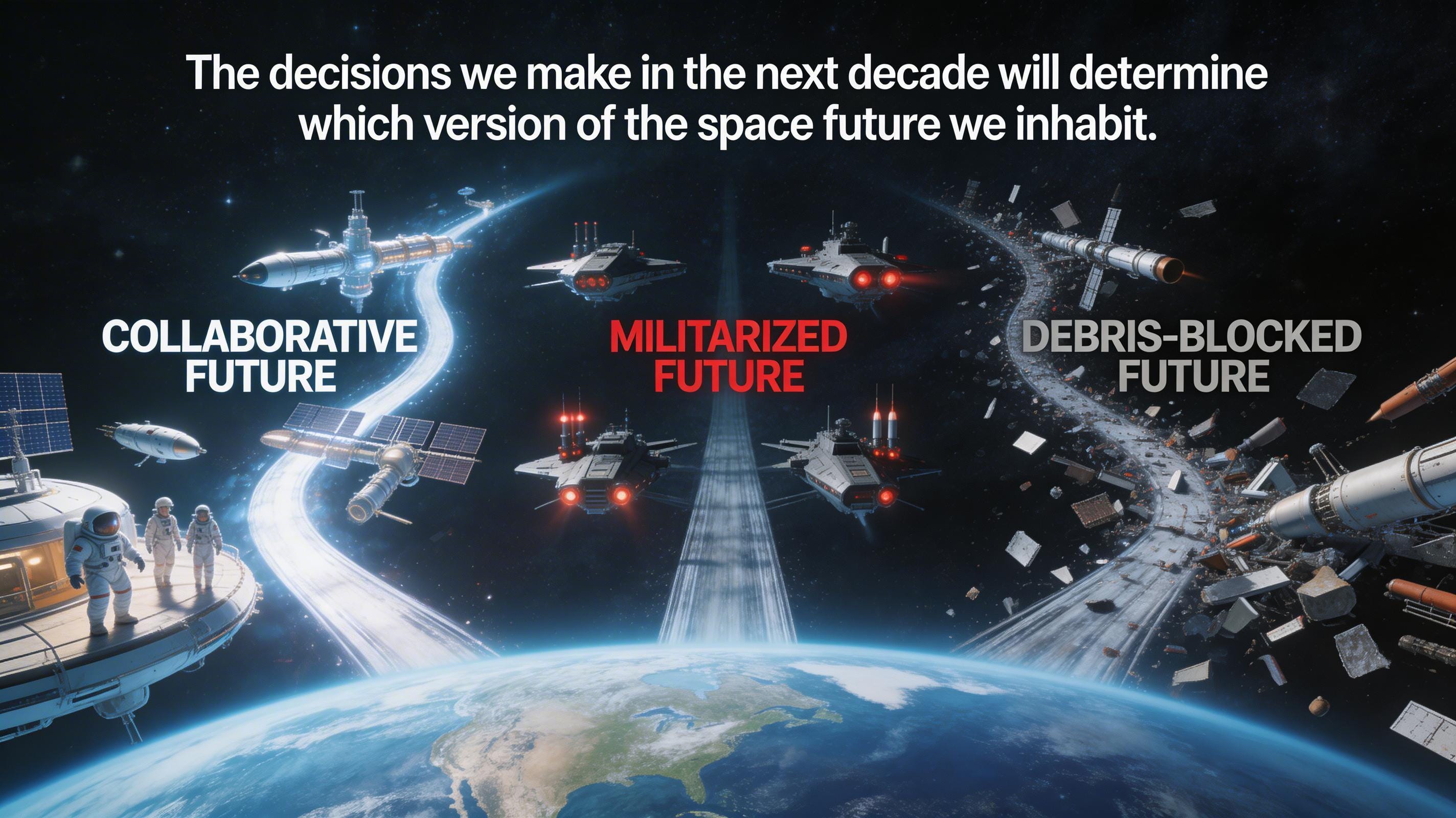 Scenario Two: The Orbital Arms Race. The same technologies — AI-driven autonomous spacecraft, rapid satellite deployment, on-orbit servicing robots — have been weaponized. Nations have deployed AI systems capable of autonomously disabling or capturing adversary satellites. A cascade of debris from a single anti-satellite test has rendered a critical orbital band unusable for a decade. GPS spoofing, powered by adversarial AI, has disrupted civilian aviation and financial markets simultaneously. The governance gap that Brookings warned about in 2026 was never closed. Space has become what the Atlantic Council feared: a domain where might makes right, and the rules are written retroactively by whoever controls the high ground.