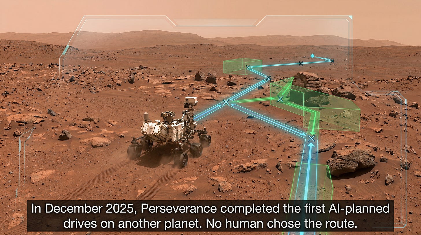 On December 8 and 10, 2025, NASA‘s Perseverance rover completed the first-ever AI-planned drives on another planet. Not AI-assisted. AI-planned. A generative AI model analyzed orbital imagery and terrain data, created waypoints, and the rover drove 456 meters without any human being choosing the route. The AI in question? Built on technology from Anthropic, one of the leading large language model companies. JPL roboticist Vandi Verma described generative AI as showing enormous promise for off-planet navigation — perception, localization, planning, and control.