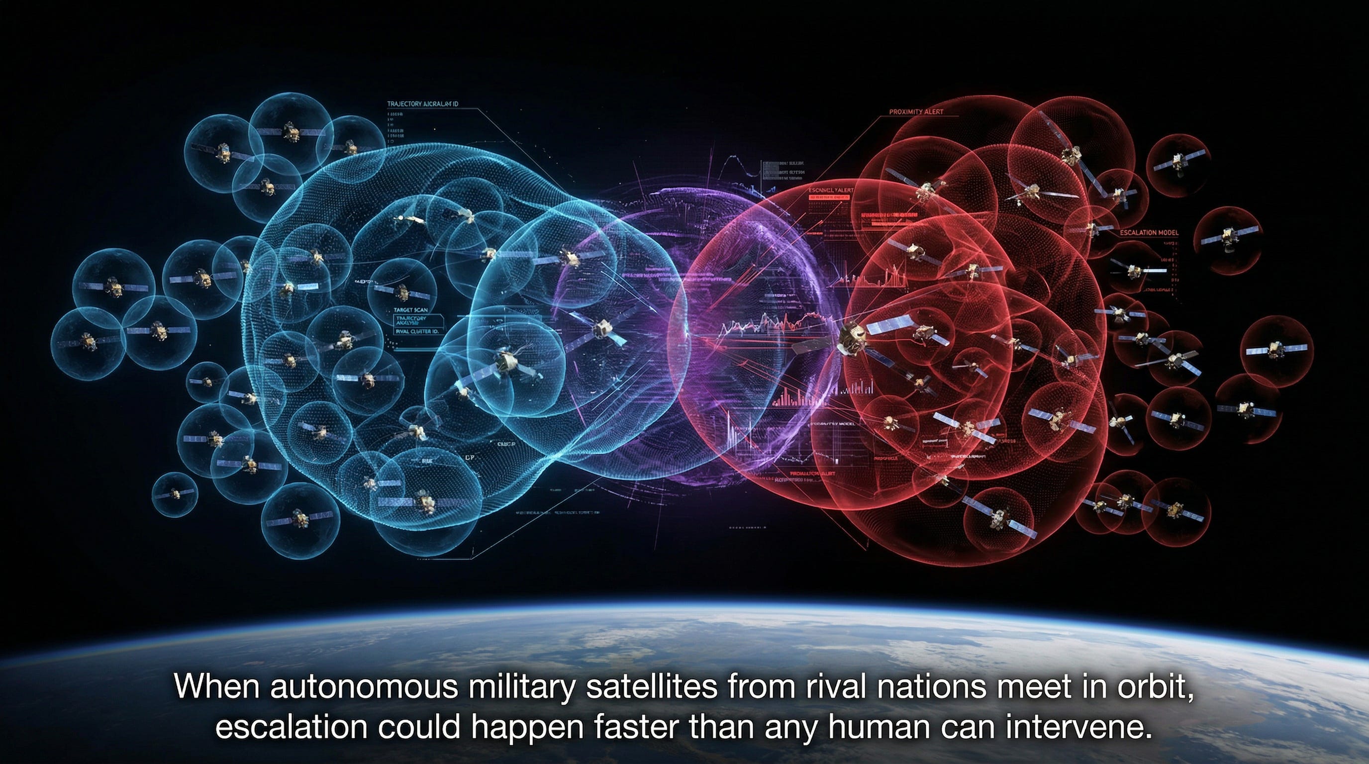 Imagine it is 2031. There are 100,000 satellites in low Earth orbit. An AI-driven collision-avoidance algorithm on one satellite miscalculates — not because it malfunctioned, but because the situation was genuinely ambiguous (two probability cones overlapping, let’s say). It fires thrusters to dodge. But that maneuver pushes it into a trajectory that another constellation’s AI flags as a threat. That second AI fires its thrusters. Now a third system detects both maneuvers and interprets the pattern as aggressive. Within seconds, dozens of satellites are maneuvering simultaneously, each reacting to the others’ reactions.