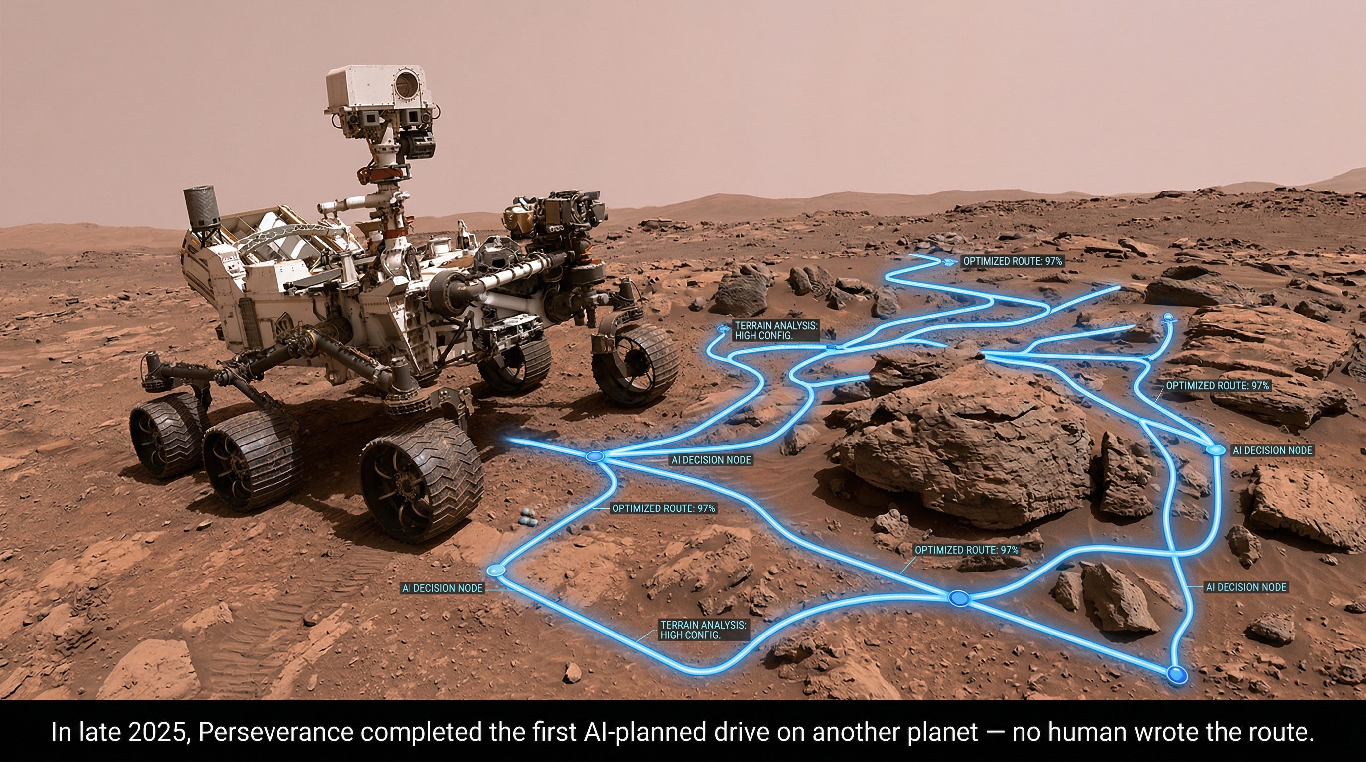 NASA‘s AEGIS system aboard the Perseverance rover autonomously selects and targets rocks for scientific analysis on Mars. Without AI, the rover hit scientifically interesting targets about 24% of the time. With AEGIS? Ninety-three percent. In December 2025, NASA’s Jet Propulsion Laboratory completed something unprecedented: the first-ever AI-planned drives on another planet. The rover drove over 800 feet across Martian terrain using waypoints generated by AI analysis of orbital imagery — instructions that no human being had written or reviewed beforehand.