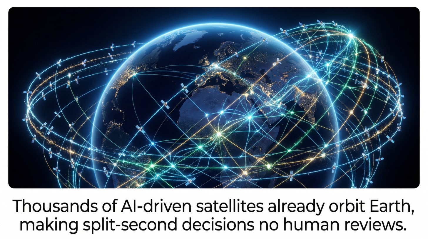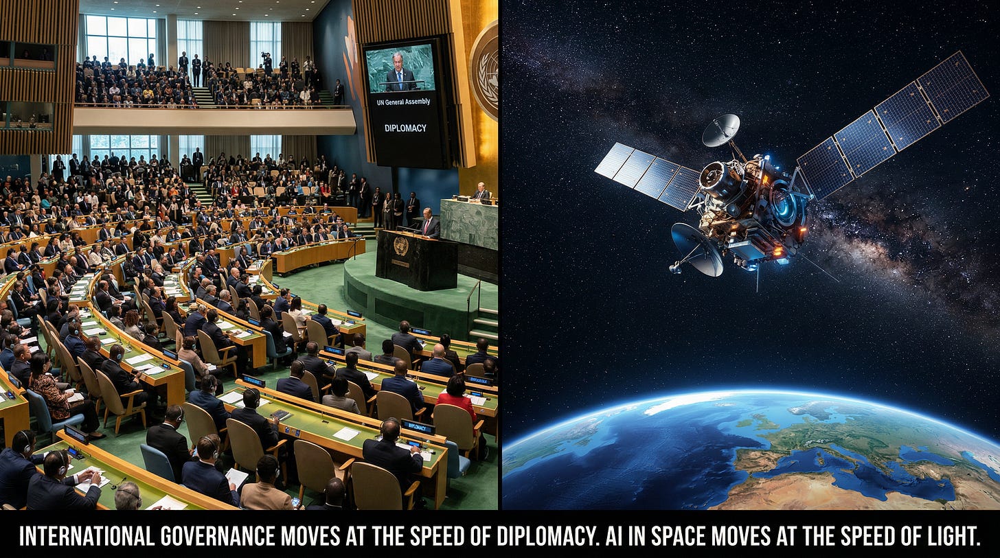 Why does this matter to you? Because the AI systems operating above your head are managing infrastructure on which billions of people depend — GPS navigation, weather forecasting, telecommunications, financial transaction timing, military early-warning systems. When those systems make autonomous decisions at machine speed, in an environment where human oversight is physically limited by the speed of light, the absence of governance is not an academic concern. It is a structural vulnerability.