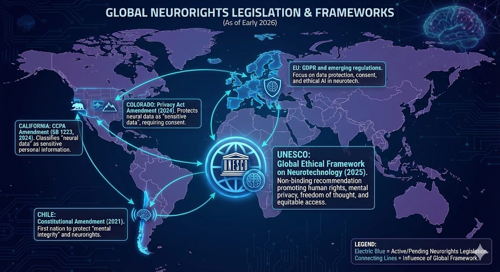 UNESCO adopted the Recommendation on the Ethics of Neurotechnology in November 2025—the first global normative framework. It protects mental privacy, bans non-therapeutic neurotechnology use on children, warns against workplace productivity monitoring, and requires explicit consent. The OECD had earlier adopted the first international standard in December 2019.