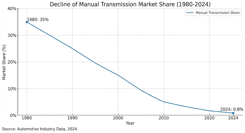 In 1980, 35% of vehicles sold in the United States had manual transmissions. Today, that number has collapsed to 0.8%. Not eight percent—zero point eight. The decline wasn’t gradual; it followed what innovation theorists call an S-curve, with a long plateau, a sudden drop, and then near-total extinction. Manufacturers now routinely eliminate manual options entirely because they’re incompatible with features like adaptive cruise control—and the electric vehicle transition eliminates multi-gear transmissions altogether.