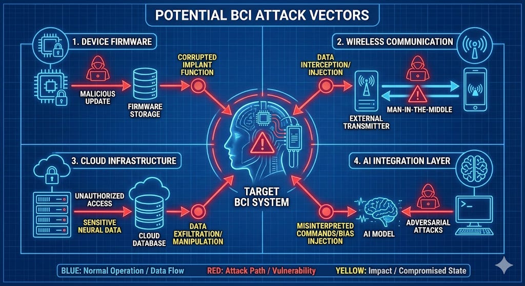 Every connected device in history—every single one—has eventually been hacked. Smartphones, cars, pacemakers, insulin pumps, baby monitors, smart home devices, voting machines. The idea that brain-computer interfaces will somehow be the exception to this universal pattern is, to put it charitably, optimistic.