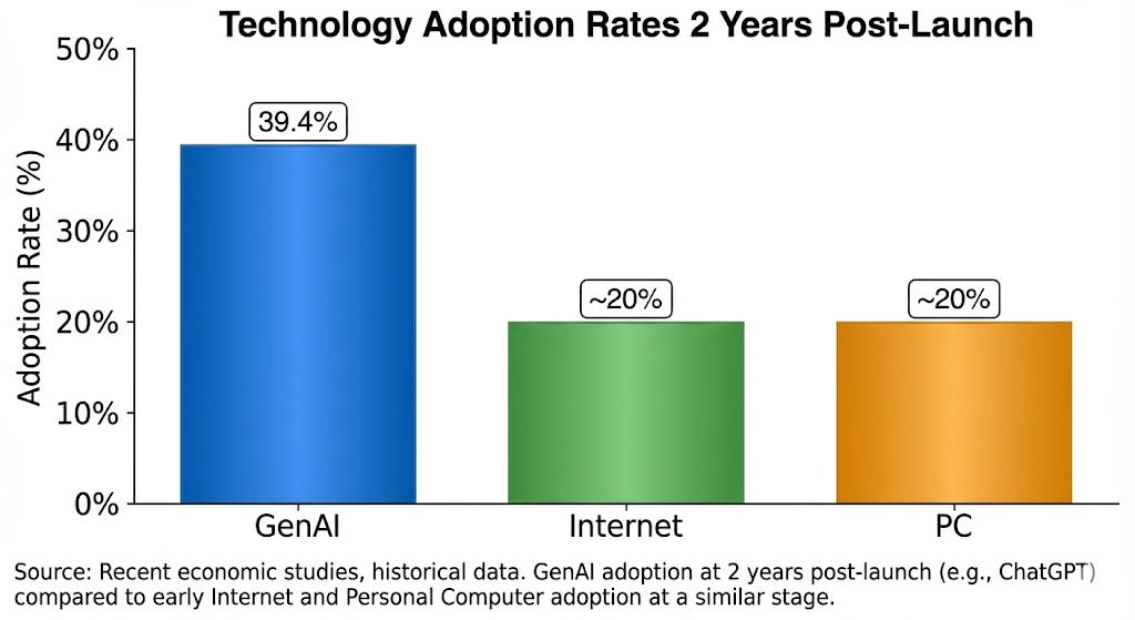 Generative AI is outpacing every previous technology adoption curve in recorded history. According to a 2024 analysis by economists Alexander Bick, Adam Blandin, and David Deming published through the Federal Reserve Bank of St. Louis, 39.4% of Americans aged 18-64 used generative AI within two years of ChatGPT’s launch. That’s roughly double the adoption rate of the internet or personal computers at the same point post-introduction.
