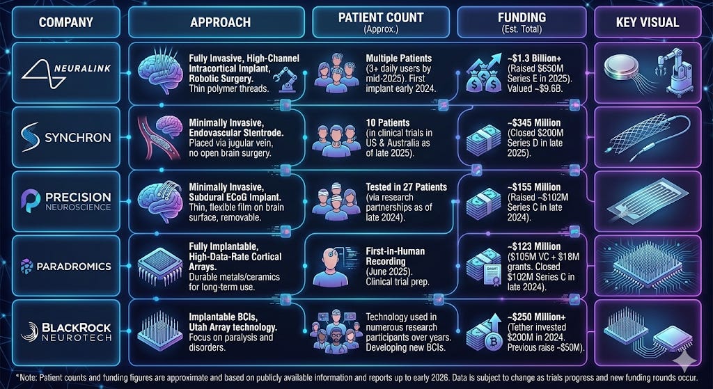 Paradromics received FDA approval in November 2025 for their Connect-One study targeting speech restoration. Blackrock Neurotech claims the largest patient footprint, with their Utah Array technology used in 40+ of approximately 50 people worldwide with implanted BCIs.