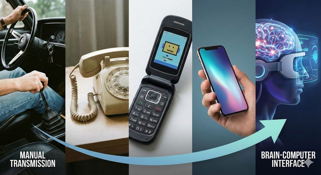 Why the pattern that left stick-shift drivers, landline loyalists, and smartphone skeptics behind is about to repeat—this time inside your skull. And why that should concern all of us.