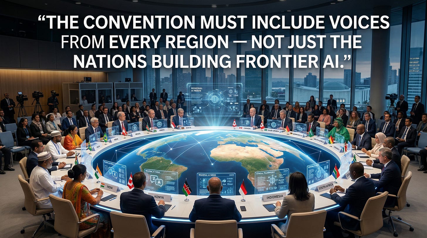 This is why we need something bigger. Not guidelines — a convention. Not recommendations — a constitution. A binding, enforceable, globally negotiated framework that establishes the non-negotiable rules for developing and deploying artificial intelligence. Think of it as the Geneva Conventions for the digital age — except instead of regulating how wars are fought, it regulates how the most powerful technology in human history is built, governed, and controlled.