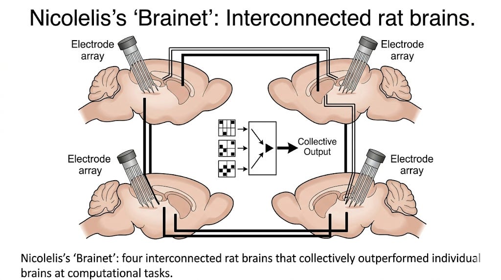 The most striking recent advances, though, are in networking brains together. Nicolelis’s lab at Duke published the first brain-to-brain interface between two rats in 2013 in Scientific Reports — one rat in Durham, North Carolina, transmitted cortical activity via the internet to a decoder rat in Natal, Brazil, which chose correct responses 60–70% of the time. By 2015, Nicolelis demonstrated “Brainets” — four rat brains interconnected via multi-electrode arrays that collectively solved computational problems. The networked brains outperformed individual brains. The architecture mimicked hidden layers of artificial neural networks.