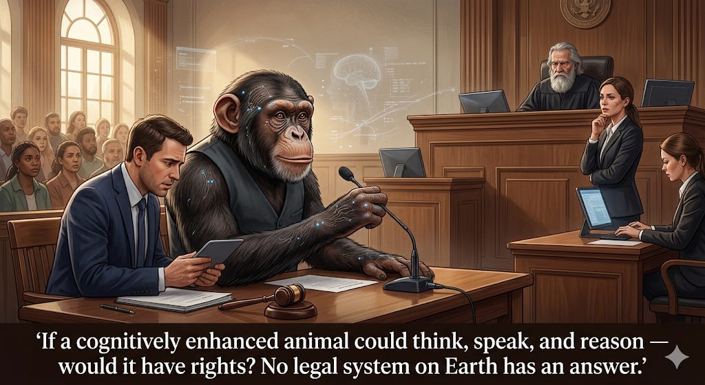 Legal frameworks remain wholly inadequate. Steven Wise’s Nonhuman Rights Project has filed habeas corpus petitions for chimpanzees and elephants in U.S. courts, and all have been rejected — though Argentina recognized an orangutan named Sandra as a “non-human person” in 2014. If an animal were cognitively enhanced to human-level intelligence, no existing legal framework in any jurisdiction would know what to do with it. Not one.