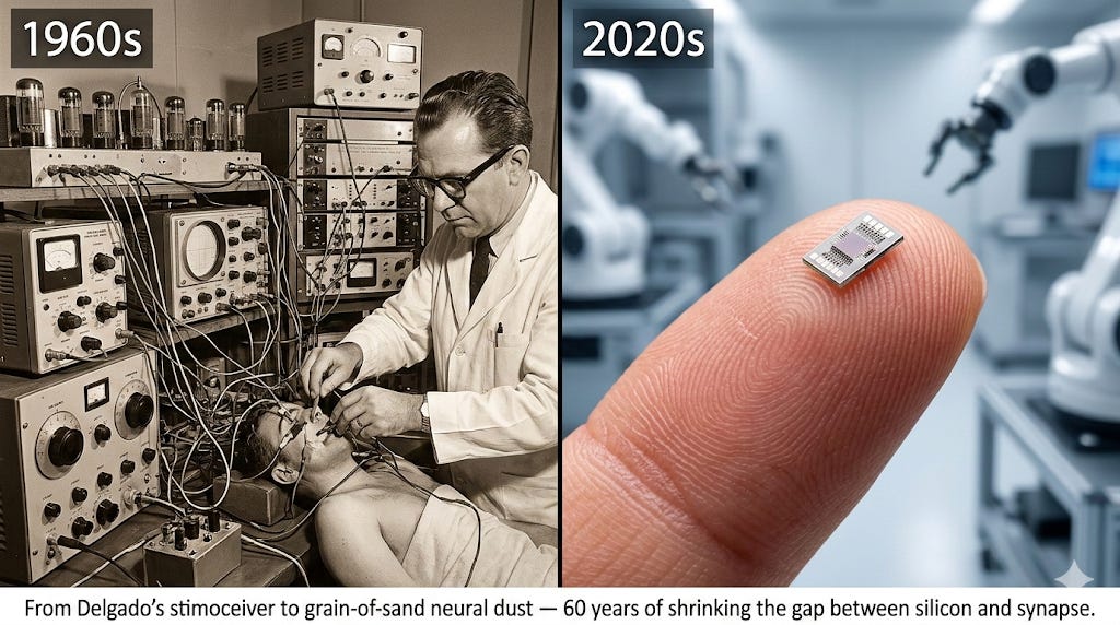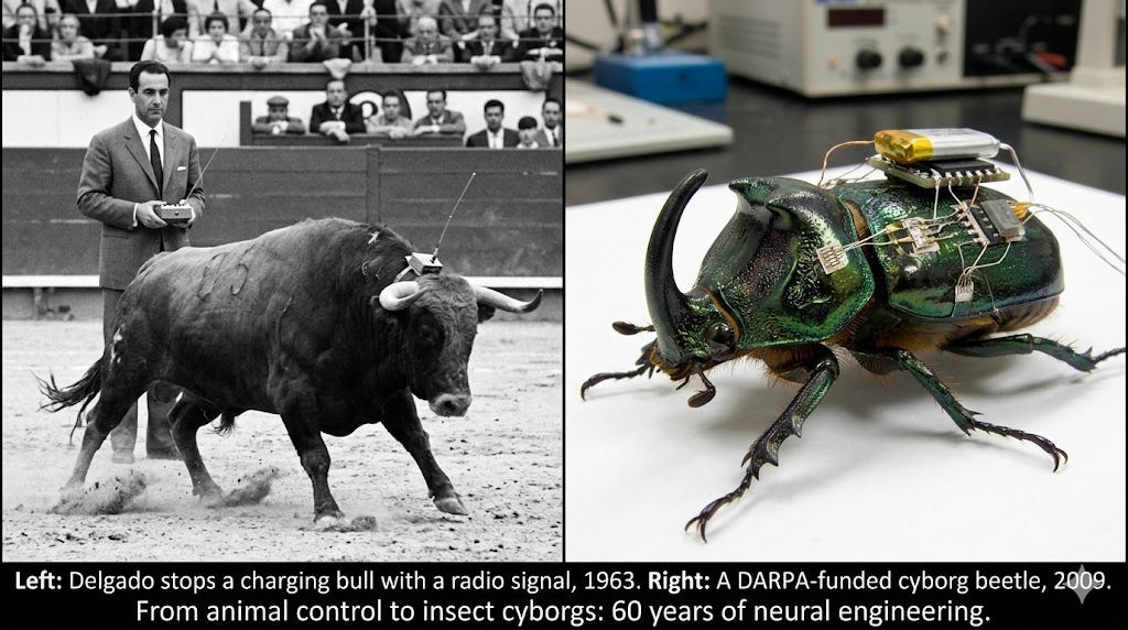 The story of computer-controlled animals begins in 1963 in a dusty bullring outside Córdoba, Spain. José Manuel Rodríguez Delgado, a Yale University professor of physiology, faced a charging 550-pound fighting bull armed with nothing but a red cape and a small handheld device. When the bull charged, Delgado pressed a button. The bull skidded to a halt. Delgado had implanted his invention — the “stimoceiver,” a wireless bidirectional device the size of a half-dollar coin — into the bull’s caudate nucleus. The New York Times ran the story on its front page in 1965. Delgado went on to publish Physical Control of the Mind: Toward a Psychocivilized Society in 1969 — a book whose title alone signals how far ahead he was thinking.