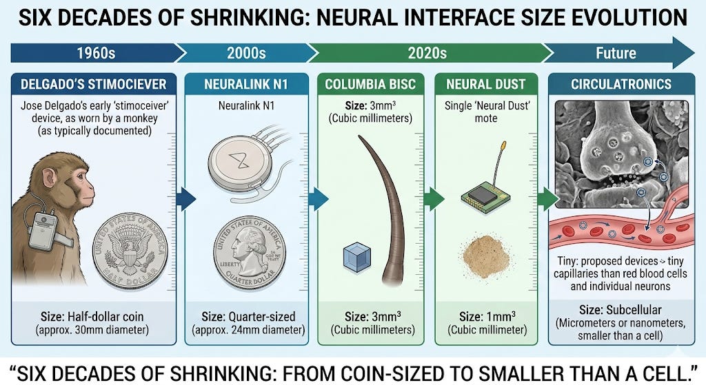 On the implant side, the miniaturization trajectory is staggering. Neuralink’s coin-sized device gives way to Columbia University’s BISC platform (published December 2025 in Nature Electronics): a single CMOS chip thinned to 50 micrometers providing 65,536 electrodes in roughly 3 cubic millimeters — about 1/1000th the size of conventional devices. Neural Dust, developed by Maharbiz and Jose Carmena at UC Berkeley (published in Neuron, 2016), demonstrated ultrasound-powered, batteryless wireless sensors shrunk to approximately 1 cubic millimeter — the size of a grain of sand. Brown University’s Neurograins are even smaller: autonomous silicon microchips at 0.5 × 0.5 millimeters, RF-powered and batteryless.