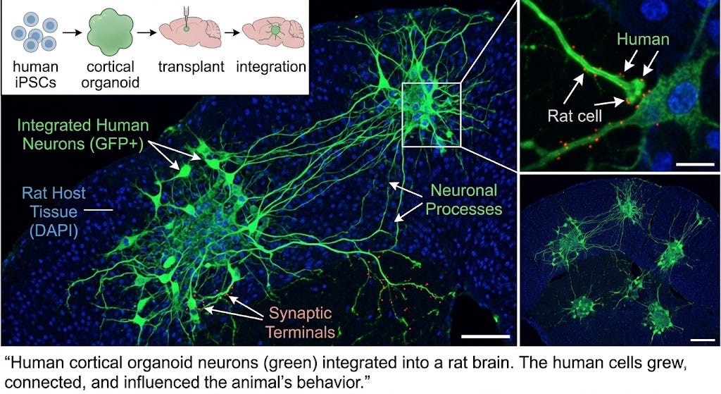 In October 2022, Sergiu Pașca at Stanford published in Nature the transplantation of human cortical organoids (essentially miniature lab-grown human brain structures) into neonatal rat brains. Approximately 80% of implants took. After six months, about one-third of the transplanted brain hemisphere consisted of human cells. The human neurons received thalamocortical inputs, responded to whisker stimulation, and — here is the part that should make you sit up — optogenetic activation of the human neurons drove reward-seeking behavior in the rats. Human brain cells, growing inside a rat, influencing the rat’s behavior.