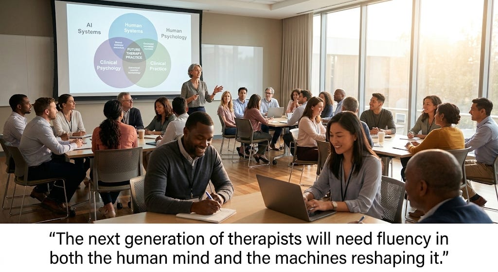 What we need, concretely, is a new specialization within mental health — call it AI-interaction psychology, or digital-relational therapy, or whatever the credentialing bodies decide. But the substance matters more than the label. We need clinicians who are trained to understand how AI systems work (not just what they do), how parasocial bonds form with non-human entities, how to assess and treat AI-induced psychosis, how to navigate AI companion grief, and how to help patients — especially young ones — rebuild the capacity for human intimacy that may be atrophying through chronic AI use.