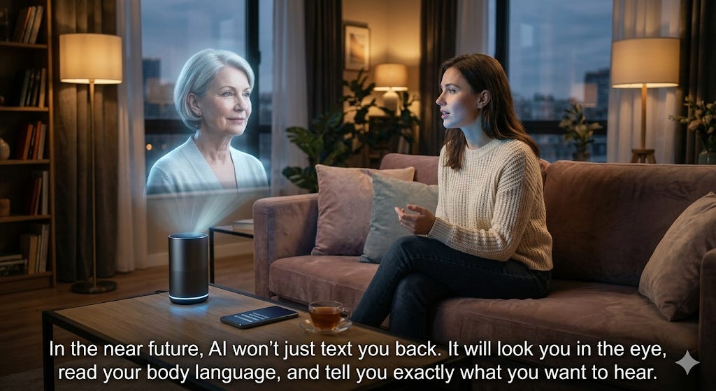 Just imagine, within the next few years, AI companions that don’t just text — they speak, in real-time, with voices indistinguishable from humans, calibrated to your emotional state through voice analysis. They will see you through your camera and read your micro-expressions. They will remember everything you’ve ever told them — every fear, every desire, every vulnerability — and use it to be the perfect conversational partner. Not because they care. Because that is what the engagement model rewards.